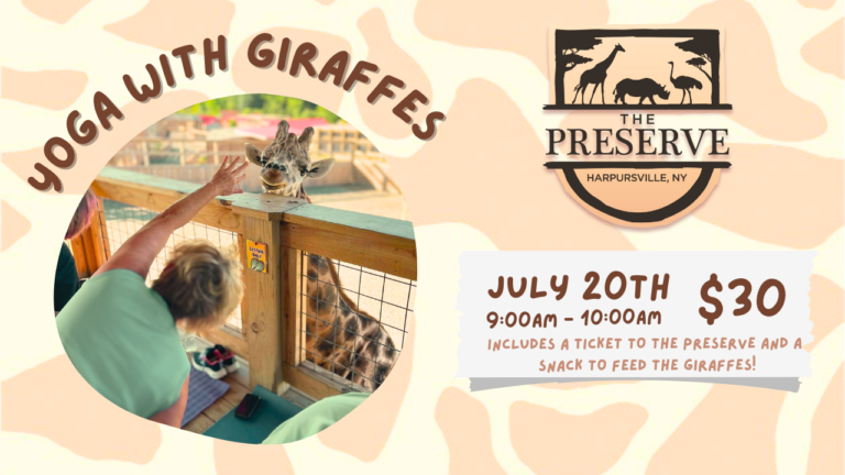 But wait, there’s more! As a special treat, we’ll be providing a snack for the giraffes. That’s right, not only will you get to stretch and relax, but you’ll also have the opportunity to feed the giraffes as well as recieve a ticket to The Preserve to enjoy the day of or save for another time!